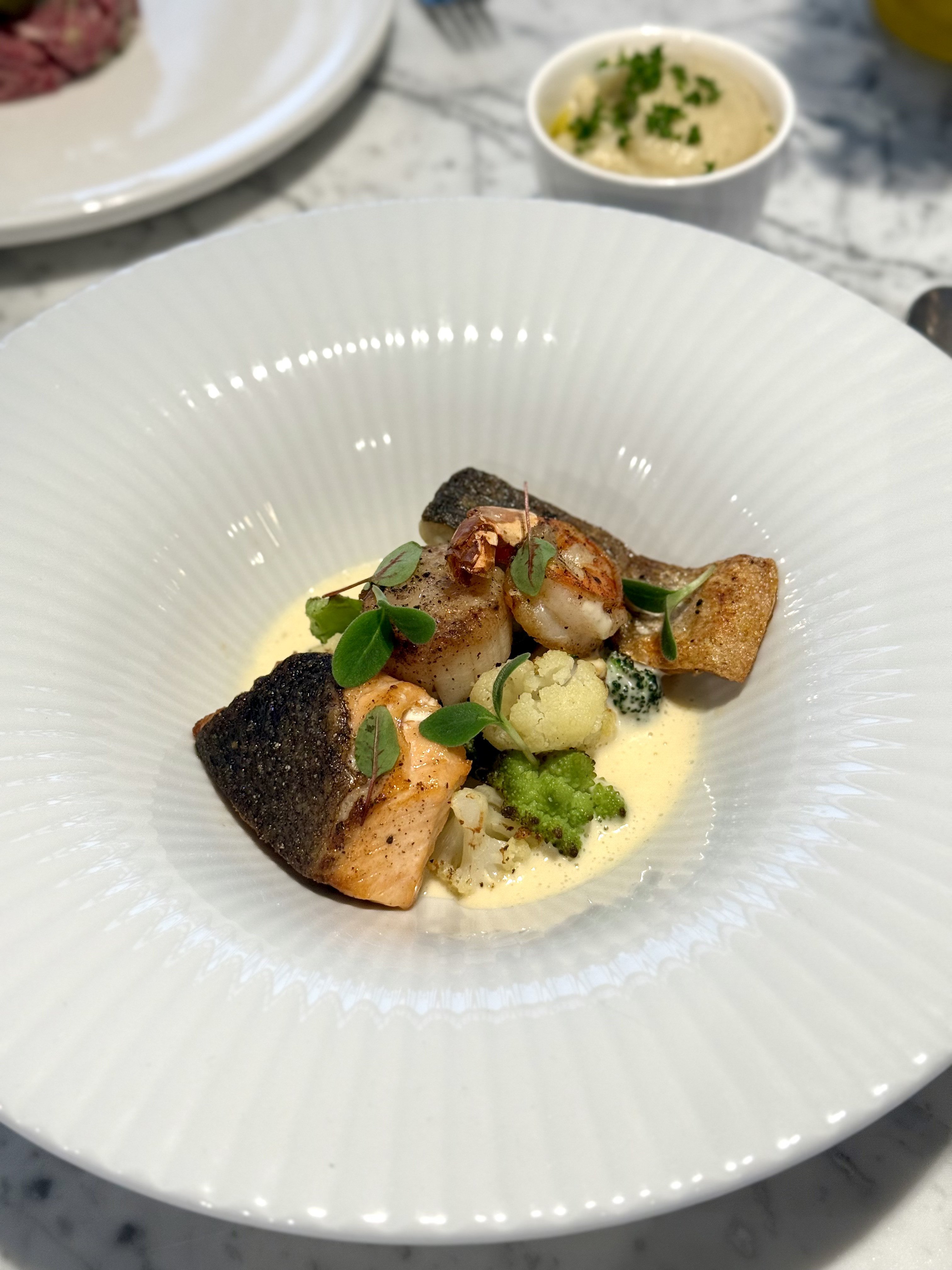 - Vispannetje - zalm - coquille - zeebaars - scampi - aardappelmousseline